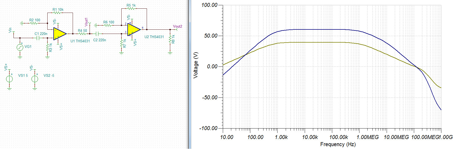 我认为THS4031的电路看起来很合适。 对于布局建议,我建议阅读THS4031数据表中提到的布局指南。 您还可以包含一个占位符,用于在RF和rg之间使用并联大写,以防遇到不稳定问题,但 放大器电路本身看起来稳定。 为了降低噪音,您可以尝试降低RF值,然后减小rg值,以保持与下面模拟中所示的相同增益。