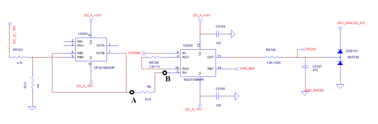 我 以前没有过IA的经验。 我想为DSP的ADC的信号调节电路制作精确的子功放器和放大器。  我的示意图见下文。 信号VOSENSE从-10.5V至0V。 我的问题是,当偏移电压(点A)为-10.3V (因为电源不是完全-15V)时,点B的电压仅为-7.22V。 我检查 了INA217引脚5的输入阻抗(R14已拆除),它是1.78 Mohm。