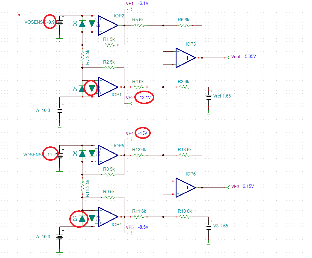 由于内部运算放大器输出(请参阅下面的VF1/VF2和VF4/VF5)从任一导轨摆动的距离不能小于2V (意味着+/-13V),因此这限制了INA217输入端可应用的电压范围。  因此,在点A为10.3V时,VOSENSE的允许范围仅为-8.9V至-VF5 11.2 ;超出上述范围的任何输入电压都会将VF1-VF5的一个输出推向其中一个导轨。  这反过来将分离每个前端运算放大器(IOP1和IOP2)的输入,从而导致其中一个背对背输入保护二极管的正向偏置(请参阅下面的红色圆圈)。  这就是您看到大输入电流流经R14电阻器的原因,因为D2或D7都是正向偏压。