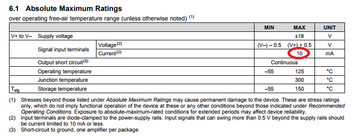 请注意,输入电流必须限制在+/-10mA以下,否则输入保护二极管可能会永久损坏-请参阅下面的绝对最大额定值表: