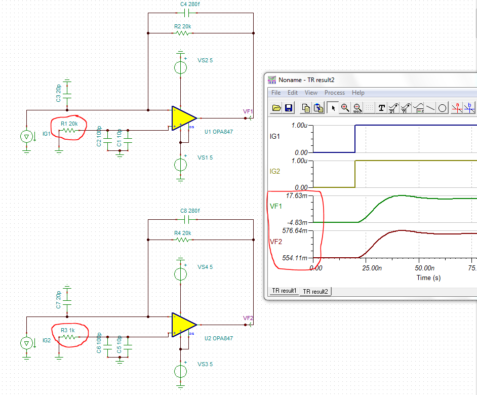我正在使用部件OPA847对TIA放大器进行仿真分析。 但是当我更改 同相输入电阻器的值时,输出端口的直流电压会有所不同。