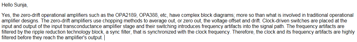 最近,我正在寻找具有出色噪声,偏移和漂移规格的OPA2189设备。 我注意到该设备的内部块与其他OPAMP设备有很大不同。 此器件包括两个时钟和三个跨导放大器。 内部时钟的用途是什么? 此设备是否可以消除时钟噪音? 能否简要解释一下内部块的运作情况?