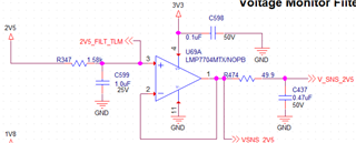 部件号:LMP7704-SP 我们正在使用LM7704缓冲ADC测量的多个模拟输入。 其中包括电源电压,其中许多电压在用于为放大器供电的电源之前出现。 例如,考虑以下电路:
