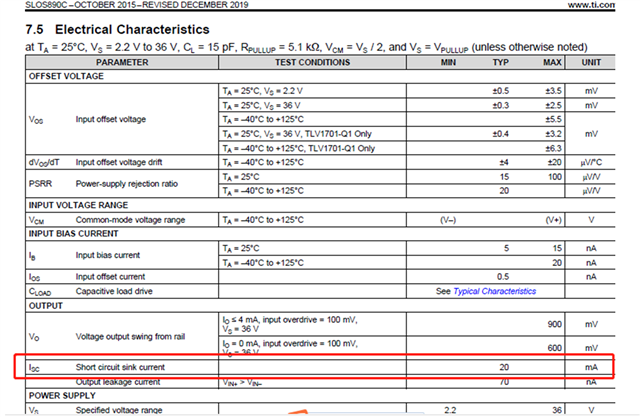 TLV1701-Q1红色框中的指示器是否意味着输出端子对电源短路、内部有一个保护电路可控制20mA 时的最大灌电流? 器件不会损坏?