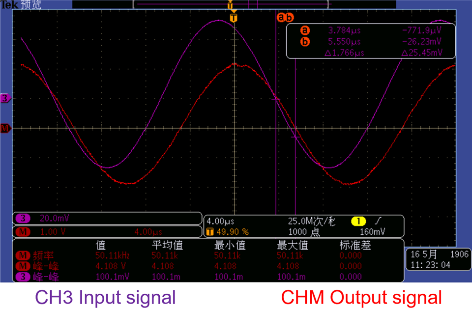 器件型号:AMC3302 在 AMC3302EVM 上进行测试、幅度为,±50mV 的正弦波输入、输入和输出的延迟为1.7us。(如下图所示)