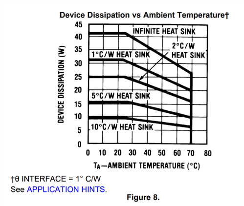 然后、根据 LM675数据表中的图8、我们可以得出最大功耗。 如果环境温度为25°C、则最大功耗为10瓦。
