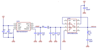 我的客户正在将 TI Delfino Launchpad 中的电压基准电路设计作为基础。  请参阅 sprui77c.pdf 中的以下电路 。  在选择组件 C23和 U19时使用了哪些标准?