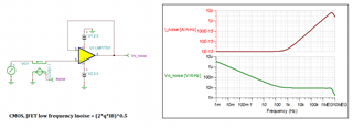 您可以使用我们的宏模型来模拟输入电流和输入噪声频谱密度-请参阅下面的。 正如 Michael 所说的那样、线性 CMOS 和 JFET 输入运算放大器中的电流噪声没有1/f 分量、并且它的值是输入偏置电流的函数、Inoise =(2*q*IB)^0.5、因此对于 Inoise 低于1pA 的 Inoise 低于1fA/rt-Hz。 在输入电容充电导致频率更高的情况下 IB 会增加-这会导致 Inoise 的伪影增加到1kHz 以上、 然后通过带宽 滚降使 Inoise 衰减到2.5MHz 以上-请参阅下文。