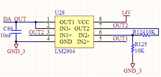 电路图如下、电源输入为14V 稳定、第一级运算放大器的输入电压 OUT1为1~4V、运算放大器后的输出 OUT2为2~8V。 OUT2是 左端电压跟随器的输入、而 DA-OUT 是输出。 在实际使用中、由于其他导线的干扰、DA-OUT 和接地(引脚1、4)之间将产生大约1.2V 的交流电压。 发现芯片经常损坏。 有两种症状:1. 跟随器的输出不随输入变化、固定为8v、12v 等。 2、1、4引脚击穿短路。 请分析情况以及如何改进电路、谢谢!