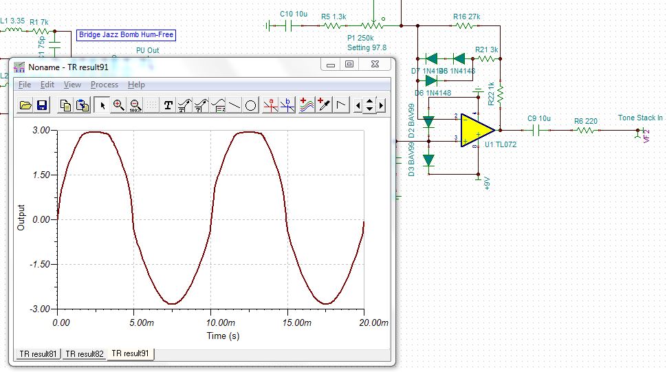 你让我思考如何设置输入来模拟一个拾音,所以我发现我的低音吉他的拾音是阻力,发现典型的爵士低音拾音是在9k 到10k 次之间缠绕的。  我找到了一些拾取仿真电路、它们使用变压器来更紧密地仿真拾取。  有人建议实际添加音调和音量控制、以更接近拾音的行为。  我这里的拾取仿真电路会产生与上述结果类似的结果。  但是、音调控制确实在电路的其余部分切断了一些较高的噪声、但我认为这可能更准确(?)。
