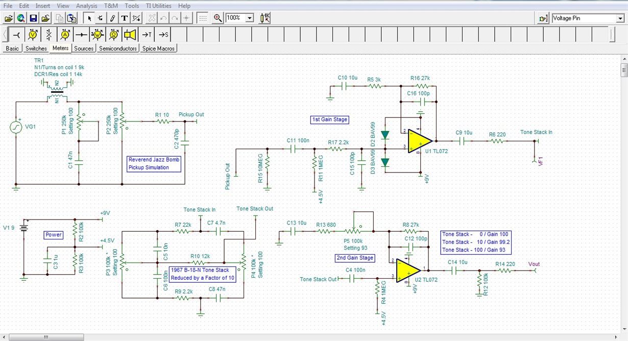 我还想看看如果我像以前的答复中那样进一步降低音调堆栈的值会发生什么情况。  似乎有同样的反应,但我想知道这是否有任何负面影响。  我还移除了第一个增益级并直接进入音调堆栈、它似乎具有类似的输出电平、但我想知道是否有理由在音调堆栈之前保留第一个增益级、或者这是否可以接受?