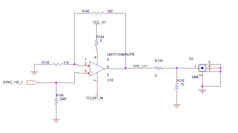 此处、从 FPGA 输入的输入信号(SYNC_vid_1)为3.3伏脉冲。 R135和 R146为 DNP。 R140和 R139分别更改为10k 和499E。 但输出不会超过7伏。