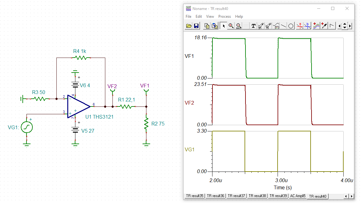 感谢您提供示波器屏幕截图。 它似乎与仿真匹配。 我认为这很可能是仿真的伪影、但它似乎是不对称的压摆/带宽限制、并在脉冲的下降时间尾随。 我与我的团队交谈、他们报告说他们看到这个部分是这样做的、并且放大器的输出很可能在内部不对称。 您是否能够使用大约1k 或更低的较低反馈电阻? 我还注意到您的新电路中的增益增加了、输入信号是否不再是3.3V?