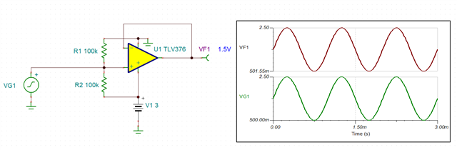 由于 TLV376的最大偏移为100uV、因此您永远不会看到2mV 偏移-请确保测量的输出电压相对于输入电压 VG1、而不是相对于接地(请参阅下面的)。