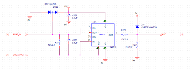 下面的电路用于基于电压的模拟输入。 它是单端的、使用 INA818的原因是对信号具有一些共模抑制。