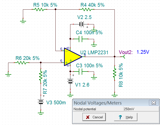 如果您执行数学运算1.25=(1+40/10) V+->0.25V 或250mV、这意味着必须在 V3处放置500mV、以便在 V+处具有250mV (R6和 R7之间的分压器)。 我放置了250mV 的 Nodal 电压/仪表、以通过 Analysis -> DC Analysis -> Calculate Nodal Voltages"来演示条件。
