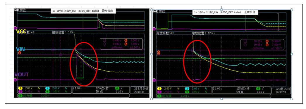 您能否回答有关 OPA192的另一个问题? 客户使用了上述原理图、当 OPA192的电源关闭时、由于 VCC 下降迅速、 OPA192的输入电压将高于 VCC (VIN>VCC)。 OPA192的输出电压产生毛刺脉冲。 原因是在上述情况(VIN>VCC)下、放大器无法正常工作。 客户已降低 VCC 的下降率、此问题已解决。 但客户仍然想知道为什么 OPA192不同芯片在相同情况下(当 Vin>Vcc 时)具有不同的输出电压。 如下图所示。 那么、您能给我们详细解释一下这种差异吗? 非常感谢。