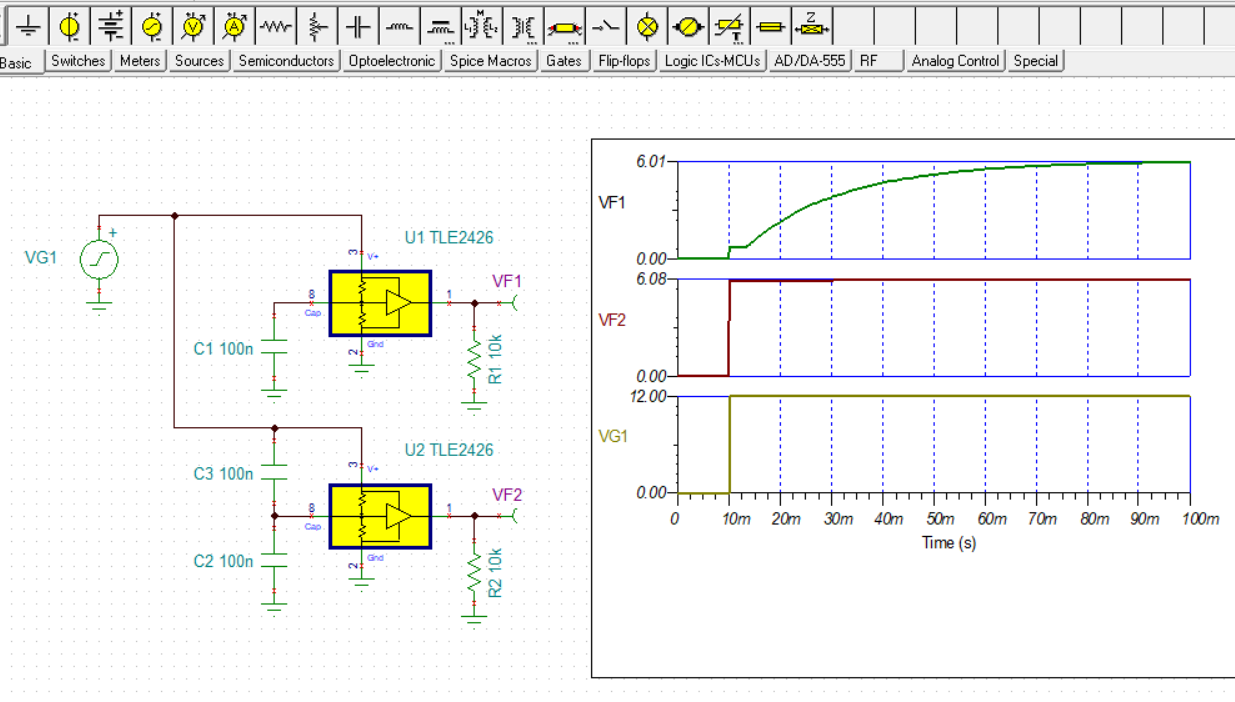 关于将电容器连接到 TLE2426降噪引脚的另一点。    如下面的 TINA 原理图所示、通过连接两个电容器可以实现更快的启动。 如果快速启动不是问题、则可以消除第二个电容器。