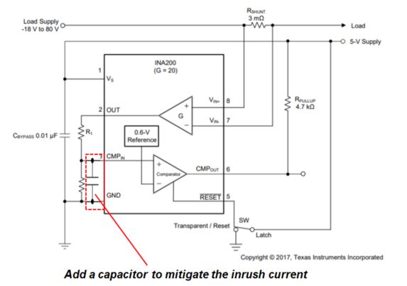 2. 使用电容、浪涌电流引起的尖峰被抑制到无法使比较器跳闸的程度。 这是一个可行的解决方案。 当然、如果可以减小或消除浪涌电流、这将是理想情况。 还有其他可能的解决方案、但我认为侵扰度最低的选项是将感应电阻器移至大电容器的下游。 这样做将使其脱离充电电流路径、理论上这个问题应该消失。 这本身并不能消除浪涌电流,但从 INA200的角度来看确实如此。
