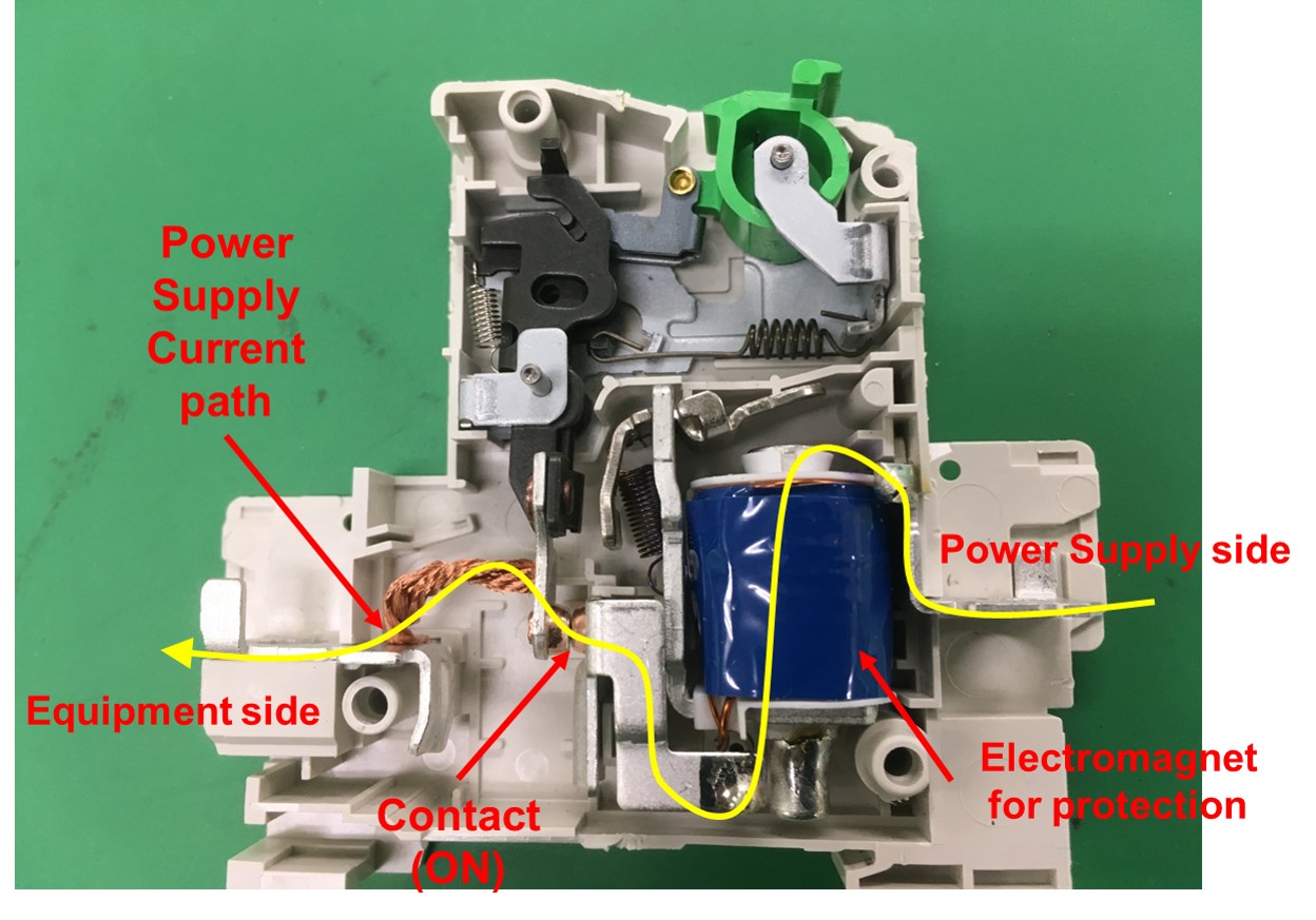 电路保护器在电源线上的内部有一个电磁体、用于在发生过流事件时关闭。