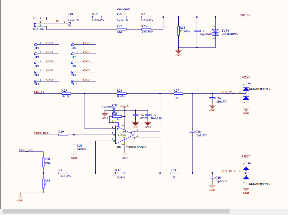 4、如果电源输入电压真的是2500V,也就是衰减器输出的6.23V,则可能需要衰减更多。 在增益为单端到差分的情况下(假设 Vref-buf 为1.65V)、Vocm 周围将为+/- 1.55V、这几乎不在输出摆幅范围内。