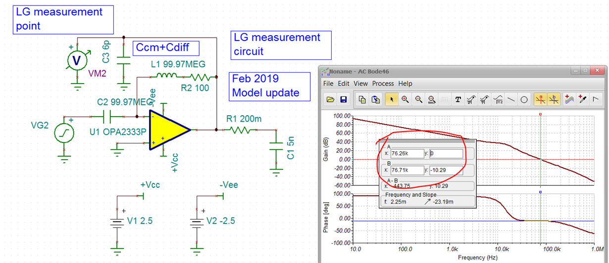 您所显示的 LG 仿真电路通常足够、但是、如果输出阻抗建模良好(模型中的更新之一)、它会与该方法中的任何反馈负载隔离。 在缓冲器电路中无关紧要、但有时会对反馈电容器产生很大影响。 这是一个稍微精确一点的 LG 仿真、这实际上表明我们已经超过180度-