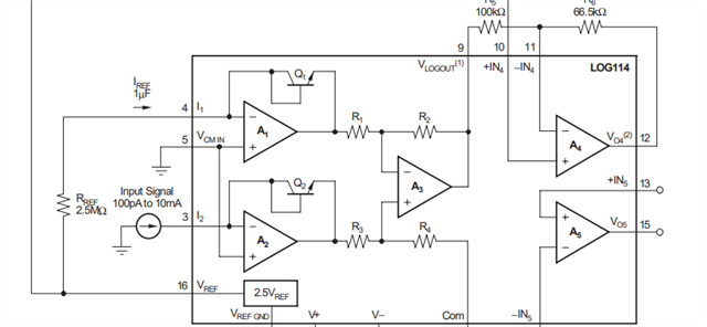 假设您将一个2.5M 电阻器的一端安装到引脚4、另一端安装到0V 和2.5V 之间的可变电压源。 然后 LOG114的输入信号是0V 至2.5V 之间的电压。 2.5M 电阻器可将输入电压转换为0A 至1µA Ω 的输入电流。