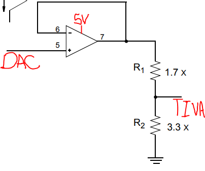 我想说、Tiva 中模拟输入的精度 很可能 取决于 MCU 的 ADC 引脚从电阻分压器窃取的电流的比例。  如果 MCU 从底部电阻器窃取大量电流、则分压器不会准确地分压电压。  会有一些偏移。  如果允许 ADC 的输入在 ADC 采样前趋稳(取决于图中 C_ADC 电容器的大小)、则这可能无关紧要。  最后、其中一些可能还取决于 DAC 的速度和电流驱动能力。