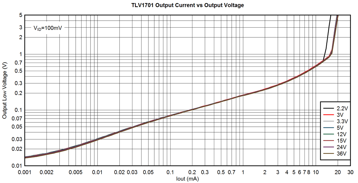 TLV1701采用2.2V 和36V 电源。 我看不到5V 电压的任何数据。
