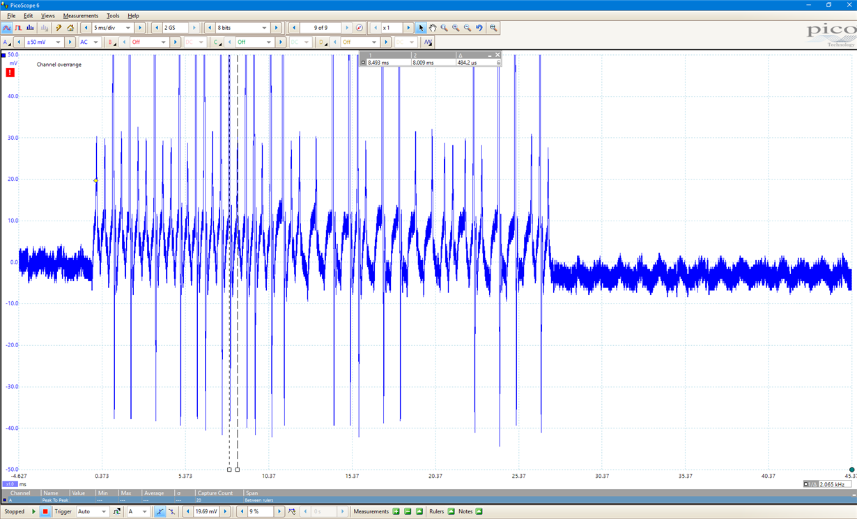 我们已经设置了具有启用 FOD 的 WPC 收发器、这与 BQ501210开发套件非常相似。 现在、我们有一个来自 Rohm 的 WPC 接收器。 如果未启用 FOD、我们可以传输高达10W 的功率、而不会出现任何问题。 但是、对于启用的 FOD、我们在这之后无法传输超过5-6W 的功率、我们将收到 FOD 警告。 我们感觉电流测量在 I_sense 线路上具有过多的噪声/纹波。 射频和 CF 的良好值是什么? 在数据表中有1 Ω/0.1 μ F、在开发套件中有10 Ω/1 μ F、这两种可能性之间有何差异? 有哪些优点/缺点?
