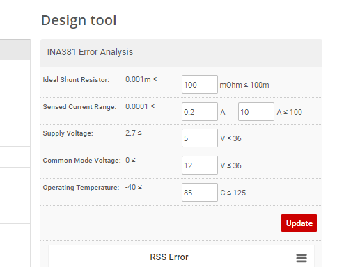器件型号:INA381 在 TI.com 上用于误差分析的设计工具中、理想分流电阻器的上限为100m Ω。 使用1欧姆电阻器实现200mA 最大电流时、预计会出现什么误差?