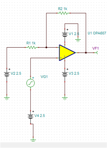 最后、OPA607不是单位增益稳定的器件。  实际上、最小稳定增益为6V/V、这就是 TINA-TI 模型具有 Rg = 1k 欧姆和 RF = 5k 欧姆的原因。  有关使用低于最小稳定6V/V 增益的 OPA607的信息、请参阅此文档: https://www.ti.com/lit/an/sboa528/sboa528.pdf