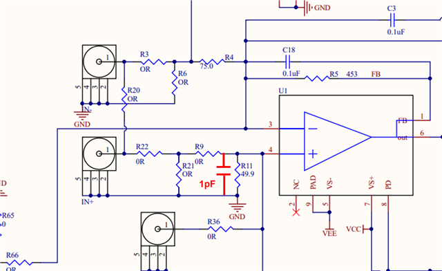 1pF 电容器添加到 IN+引脚、该引脚不处于反馈环路中。 我认为该电容器会导致稳定性问题的原因是什么。