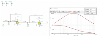 正如 Michael 所指出的、您始终可以使用高通滤波器和低通滤波器来实现带通滤波器。 当我对此进行测试时、滤波器设计工具能够为低通和高通滤波器推荐一个放大器。 推荐使用低通滤波器的 OPA2690、该器件是双通道放大器、因此可同时用于两级。 下面的显示了使用 OPA2690后一个二阶巴特沃斯高通滤波器和一个二阶巴特沃斯低通滤波器的实现。