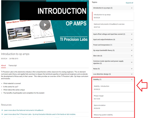 通过滚动到下图所示的稳定性、您可以找到"TI 高精度实验室:运算放大器稳定性"课程。