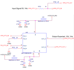 我们有5V、1Hz 的输入信号、所需的输出是10V、1Hz。 正在使用运算放大器 LM7372。以下是 sch 部分。 电源电压为+/-12V