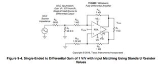 当然、您也可以拥有一个 FDA、它是 G=1V/V 配置中的单端输入源至差分输出。 数据表中的图8-1和图9-4显示了该配置。 为了与 ADC 连接、您的负载将与这些图中所示的负载不同。 但是、为了生成单端输入信号且 G=1V/V、反馈网络和输入级应该相似。