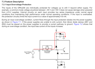 此外、Harris 器件的数据表列出了最大差分输入电压、最大输入电流和输出过冲。 但是、TI 器件 OPA4206的数据表未明确/直接为这些参数指定值。 能否验证以下解释是否正确?