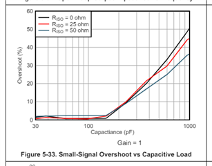 3.输出过冲至阶跃输入电压–小信号和大信号阶跃响应的图形(在表18中)表明没有过冲、但也没有针对这个参数的明确规格。