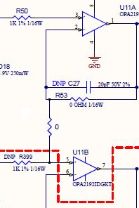 感谢您的回复和分享的文章。 我们将使用单电源(5V)。 我附上了我们的设计图片。 根据新的设计要求、不需要连接到 U11B 的元件。 (该部分不是必需的)、因此我们将它们设置为 DNP (不填充)。 因为我们不能将运算放大器的未使用引脚保持悬空。 我们能否使用安装的 R59 (0欧姆)配置来实现负反馈、并将 R399和 R58替换为0欧姆以将 OPAMP 的同相端子连接到 GND? 剩余的分量将为 DNP。 根据我们的设计、似乎很难将非反相端子连接到 Vref。 请提供对该参数的回答。