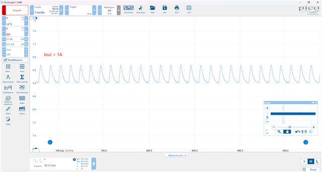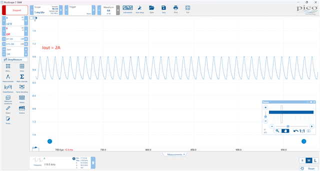 我想测量直流/直流降压 Iout、 直流/直流芯片 TPS62933正常运行:稳定的 Vout=12V、干净的 PWM 信号、温度正常。 我正在使用电子负载从直流/直流转换器汲取稳定的1A、2A 和3A 输出电流。