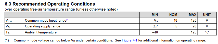 在 INA290数据表中、VCM 范围指定为 Vs (V)~ 120 (V)、如下所示。