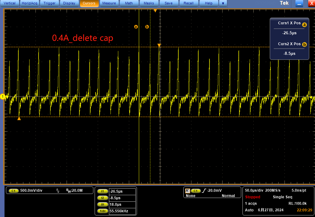 我在输出端添加了一个220uF 电容器、但当电流超过400mA 时似乎仍然存在振荡