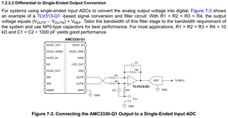 客户似乎有兴趣使用运算放大器将差分输出转换为单端输出、并将其馈送到 MCU、他们正在寻找演示此情况的示例电路。 是这样吗? 如果是、数据表提供了很好的示例供您入门使用: