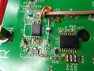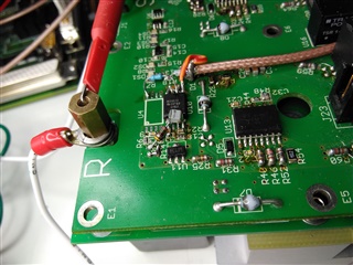 在照片中、您可以看到、1nF 电容器(1206)焊接在5.1nF ATC 电容器下、其直接焊接在引脚上、信号由分流器通过15欧姆碳电阻器提供。