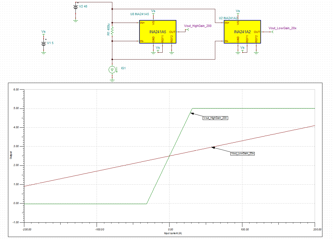 我正在为具有一些非常高的峰值以及长时间低电流的应用设计一个电流感应电路。 非常准确地测量低电流对于性能而言非常重要、能够测量高峰值电流对于安全而言也非常重要。 我想在我的微控制器上使用两个单独的通道作为电流传感器输入。 想法是具有极高增益的电流感应放大器、该放大器会在大约20A 电流流过分流器时有意轨、这时微控制器会切换到读取第二个电流感应通道、该通道具有较低的增益、并且能够读取高达200A 的电流。 推动此设计的限制因素是微控制器 ADC 的分辨率有限。