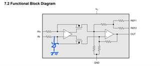 我们的客户想知道该器件是否具有连接到 IC 内部 IN+和 IN-的某种保护功能、例如连接到 GND 的 ZD。 如果您能更详细地介绍内部电路、那将会非常有用。 下图表明客户希望在 GND 和 IN+/IN-之间连接 ZD: