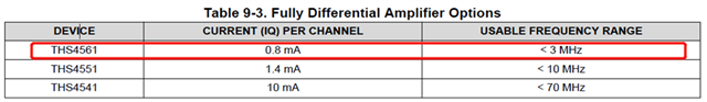 此外、ADC3663数据表中提到 THS4561的可用频率范围是多少: