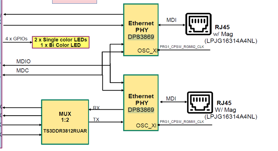 EVM 具有堆叠端口。 其中1个在 CPSW 和 ICSS 之间进行多路复用。 您可能会注意到、EVM 具有3个 PHY (DP83867IRRGZ)。