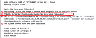 我试图把越来越多的信息,以便你可以检查它. 我的发现是在项目目录中、.ipcf 文件是由项目本身的名称生成的、即 Project.eww、然后它生成文件 Project.ipcf、而在输出窗口中它显示错误 failed - Syss.ipcf Config_Generated_Files